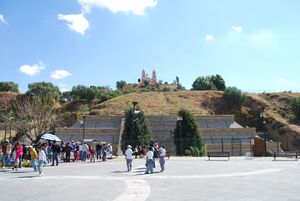 The most important tourist attraction of the city is the Great Pyramid with the Nuestra Señora de los Remedios sanctuary on top. At first glance, the pyramid looks like a hill as most of it is overgrown. The south side of the pyramid has been excavated and there is a network of tunnels inside.[3] The pyramid and church receives about 220,000 visitors each year, and on certain special occasions such as the spring equinox and the feast of the Virgin of the Remedies, there can be up to 20,000 visitors at a time.[23] From the top of the pyramid, in the sanctuary atrium, it is possible to see the Malinche, Popocatepetl, Iztaccíhuatl and Pico de Orizaba Volcanoes in the far eastern horizon.[24]