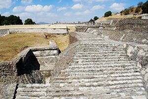 During this time period, there is also evidence of influence from the larger Teotihuacan in the Valley of Mexico.[9][28] However, the exact nature of the relationship between the two cities is not entirely known. One stage of the Great Pyramid is done in talud-tablero architecture, similar to that of Teotihuacan, but the next stage uses a different style, with stairs leading to the top on all four sides. The stage after this one, built during the decline of Teotihuacan, again returns to talud-tablero. Pottery styles between the two cities are similar, especially in the early Classic period, but living spaces and some religious iconography was different. When Teotihuacan declined, Cholula also suffered a significant population decline. At this time, the area took part in the Epi-classic central Mexican culture, and the iconography changes to show Gulf coast influence. Religious focus was kept on the Great Pyramid, but added its own layers to the work.[28]