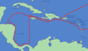 في 3 أغسطس عام 1492 أبحر كولومبوس غرباً على رأس ثلاث سفن من ميناء بالوس جنوبي إسبانيا، ووصل إلى محطته الأولى في جزر الكناري، ومنها انطلق إلى منطقة جزر الباهاما التي وصلها في 12 أكتوبر من العام نفسه؛ والتي اعتقد كولومبوس أنها إحدى جزر الهند الشرقية، وأطلق على سـكانها اسم الهنود، وهي التسمية التي اسـتمرت على الرغم من تبيّن خطأ تسمية المكـان بعد ذلك بفترة وجيزة. وفي 28 أكتوبر 1492 وصل أسطول كولومبوس إلى السواحـل الشمالية لجزيرة كوبـا التي اعتقد أنها بلاد الصين. وقبل العودة في 16 يناير 1493، قام كولومبوس ببناء قلعة في جزيرة هاييتي أوكل أمر حمايتها إلى أربعين من رجاله، ووصل إلى إسبانيا بعد رحلة شاقة حمل فيها عدداً من منتجات الأراضي الجديدة، إضافة إلى عدد من سكانها الهنود.