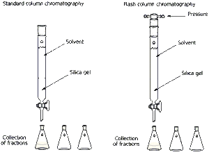 Column chromatography is a separation technique in which the stationary bed is within a tube. The particles of the solid stationary phase or the support coated with a liquid stationary phase may fill the whole inside volume of the tube (packed column) or be concentrated on or along the inside tube wall leaving an open, unrestricted path for the mobile phase in the middle part of the tube (open tubular column). Differences in rates of movement through the medium are calculated to different retention times of the sample.[13][14] In 1978, W. Clark Still introduced a modified version of column chromatography called flash column chromatography (flash).[15][16] The technique is very similar to the traditional column chromatography, except that the solvent is driven through the column by applying positive pressure. This allowed most separations to be performed in less than 20 minutes, with improved separations compared to the old method. Modern flash chromatography systems are sold as pre-packed plastic cartridges, and the solvent is pumped through the cartridge. Systems may also be linked with detectors and fraction collectors providing automation. The introduction of gradient pumps resulted in quicker separations and less solvent usage.