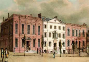View of the northeast corner of William and Wall streets. The house to the far right became City Bank of New York's first home at 38 Wall Street, later renumbered as No.52. (Painting by Archibald Robertson, c. 1798)