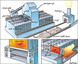 A fire brick chamber shaped like a dome is used, commonly known as a beehive oven. It is typically about 4 متر (13 ft) wide and 2.5 متر (8 ft) high. The roof has a hole for charging the coal or other kindling from the top. A discharging hole is provided in the circumference of the lower part of the wall. In a coke oven battery, a number of ovens are built in a row with common walls between neighboring ovens. A battery consisted of a great many ovens, sometimes hundreds, in a row.[7]