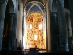 The territory of the Commune extended beyond the town of Como itself, encompassing the entire diocese, which included most of present-day Province of Como, modern-day Canton of Ticino, Valtellina, Valchiavenna, and Colico.[19][20] Thanks to its strategic position on Lake Como and the important Road of Queen Theudelind, which linked the Italian Peninsula with Germany: the heart of the Holy Roman Empire, Como quickly became a wealthy and powerful town.[21]