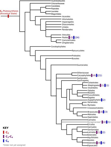 Angiosperm phylogeny of orders based on classification by the Angiosperm Phylogeny Group. The figure shows the number of inferred independent origins of C3-C4 photosynthesis and C4 photosynthesis in parentheses.