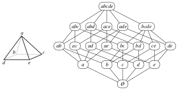 The face lattice of a square pyramid, drawn as a Hasse diagram; each face in the lattice is labeled by its vertex set.
