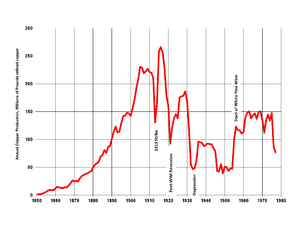 Annual production peaked in 1916 at 266 million رطل (121،000 metric ton) of copper. Most mines closed during the great depression as a result of depressed copper prices. Many mines reopened during World War II, when wartime demand pushed copper prices higher. The end of the war brought an end to high prices, and nearly all companies closed, leaving only the Calumet and Hecla, Quincy, and Copper Range mining companies. Both Calumet and Hecla and Quincy survived largely by reprocessing the stamp sand left from older mining operations, leaching out copper left by more primitive processing techniques.[9]