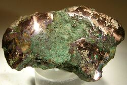 Although native copper was the dominant ore mineral, chalcocite (copper sulfide) was sometimes present, and, especially in the Mohawk mine, copper arsenide minerals such as mohawkite and domeykite. Gangue minerals included calcite, quartz, epidote, chlorite, and various zeolites. A number of copper mines also contained a notable amount of silver, both in native form and naturally alloyed with the copper. Halfbreed is the term for an ore sample that contains the pure copper and pure silver in the same piece of rock; it is only found in the native copper deposits of the Upper Peninsula of Michigan.[2]