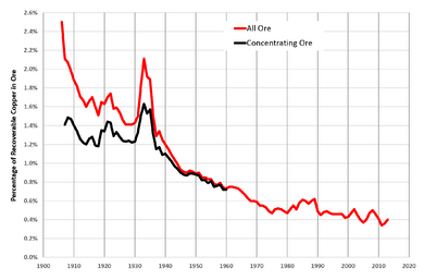 Large-scale mining of low-grade orebodies became predominant, and the amount of direct-shipping ore mined fell drastically in the first half of the 20th century, and by 1960, the contribution of direct-shipping ore was insignificant. Improvements in low-cost mining and ore processing allowed the average ore grade of milling ore to decline.