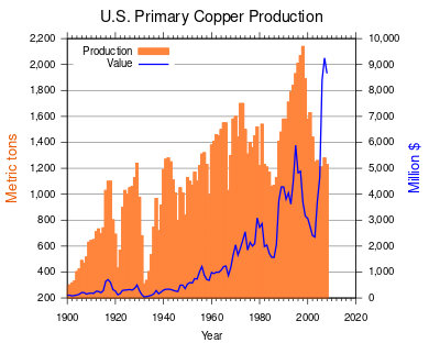Copper mining activity increased in the early 2000s because of increased price: the price increased from an average of $0.76 per pound for the year 2002, to $3.02 per pound for 2007.[2]