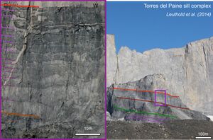 11. ^ Leuthold, Julien; Müntener, Othmar; Baumgartner, Lukas; Putlitz, Benita (2014). "Petrological constraints on the recycling of mafic crystal mushes and intrusion of braided sills in the Torres del Paine Mafic Complex (Patagonia)" (PDF). Journal of Petrology. 55 (5): 917–949. doi:10.1093/petrology/egu011. hdl:20.500.11850/103136.