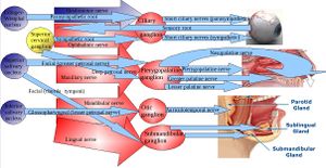 IX | العصب اللساني البلعومي | مختلط حسي وحركي | النخاع المتطاول(البصلة) | النواة المبهمية Nucleus ambiguus، النواة تحت اللعابية، نواة السبيل المفرد | يستقبل حس الذوق من الثلث الخلفي للسان، يؤمن الألياف الإفرازية للغدة النكفية، يؤمن التعصيب الحركي العضلة الإبرية البلعومية. ينقل بعض الأحاسيس إلى الدماغ من اللوزتين الحنكيتين، يحول الإحساس إلى المهاد وبعض الأنوية الوطائية, يصل عبر الثقبة الوداجية |