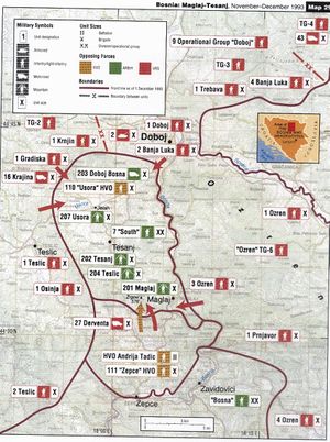 On 29 October, the VRS captured Jajce due to the inability of ARBiH and HVO forces to construct a cooperative defense.[28] The VRS held the advantage in troop size and firepower, staff work, and its planning was significantly superior to the defenders of Jajce.[29] Croat refugees from Jajce fled to Herzegovina and Croatia, while around 20,000 Muslim refugees remained in Travnik, Novi Travnik, Vitez, Busovača, and villages near Zenica.[30]