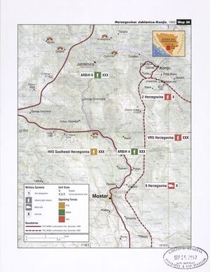 The war had spread to northern Herzegovina, firstly to the Konjic and Jablanica municipalities. The Bosniak forces in the region were organized in three brigades of the 4th Crops and could field around 5,000 soldiers. The HVO had fewer soldiers and a single brigade, headquartered in Konjic. Although there was no conflict in Konjic and Jablanica during the Croat-Bosniak clashes in central Bosnia, the situation was tense with sporadic armed incidents. The conflict started on 14 April with an ARBiH attack on a HVO-held village outside of Konjic. The HVO responded with capturing three villages northeast of Jablanica.[52] On 16 April in the village of Trusina, north of Jablanica, 15 Croat civilians and 7 POWs were killed by an ARBiH unit called the Zulfikar upon taking the village.[53] On the following day the HVO attacked the villages of Doljani and Sovići east of Jablanica. After taking control of the villages around 400 Bosniak civilians were detained until 3 May.[54] The HVO and ARBiH fought in the area until May with only several days of truce, with the ARBiH taking full control of both the towns of Konjic and Jablanica and smaller nearby villages.[52]