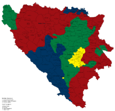 By November 1992, the HVO controlled about 20 percent of Bosnia and Herzegovina.[31] By December 1992, much of Central Bosnia was contrioled by the Croats.[32] Bosniak authorities forbade Croats from leaving towns such as Bugojno and Zenica, and would periodically organise exchanges of local Croats for Muslims.[33] On 18 December, the HVO took over power in areas that it controlled: it dissolved legal municipal assemblies, sacked mayors and local government members that were against confrontation with Bosniaks, and disarmed remaining Bosniak soldiers except for those in Posavina.[34]