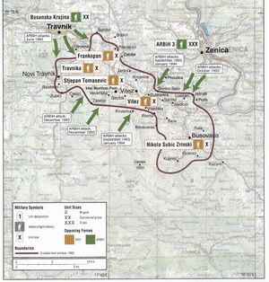 In July, the ARBiH was tightening its grip on Kiseljak and Busovača and pushed closer towards Vitez and Novi Travnik.[72] Due to its location on the outskirts of the besieged Sarajevo, the Kiseljak enclave was an important distribution center of smuggled supplies on the route to Sarajevo.[73] Bosniaks and Croats both wanted control over it. Until the summer, most of the fighting took place in the northern area of the enclave and west of the town of Kiseljak. During the April escalation, the HVO gained control over villages in that area. Another round of fighting started in mid June when the ARBiH attacked HVO-held Kreševo, south of Kiseljak.[74] The attack started from the south of the town and was followed by a strike on villages north and northeast of Kiseljak. The ARBiH deployed parts of its 3rd and 6th Corps, about 6–8,000 soldiers versus around 2,500 HVO soldiers in the enclave.[75] The attack on Kreševo was repelled after heavy fighting and the HVO stabilized its defence lines outside the town. The next target of the ARBiH was Fojnica, a town west of Kiseljak. The attack began on 2 July with artillery and mortar attacks, just days after the UNPROFOR Commander called the town "an island of peace". Fojnica was captured in the following days.[74]