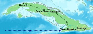 Map of Cuba showing the location of the arrival of the rebels on the Granma yacht in late 1956 and the rebels' stronghold in the Sierra Maestra. The map also shows Guevara and Cienfuegos's route towards Havana via Las Villas Province in December 1958.