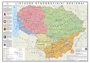 Lithuania can be divided into five historical and cultural regions (called ethnographic regions). The exact borders are not fully clear, as the regions are not official political or administrative units. They are delimited by culture, such as country traditions, traditional lifestyle, songs, tales, etc. To some extent, regions correspond to the zones of Lithuanian language dialects. This correspondence, however, is by no means strict. For example, although the Dzūkian dialect is called South Aukštaitian, it does not mean that Dzūkija is part of Aukštaitija. In certain parts of some regions, dialects of other regions are spoken, while for example in Samogitia, there are three indigenous dialects (southern, northern and western Samogitian), some of which are subdivided into subdialects.[بحاجة لمصدر]