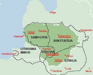 Dzūkija or Dainava: the latter name literally means "Land of songs". | Southeast of Lithuania, also includes vast historically Lithuanian territories of Belarus, and some territories of Poland. | Alytus | |