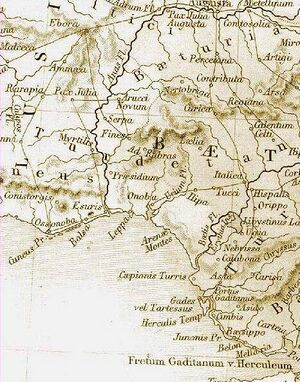 Map of the Gulf of Cádiz in Antiquity. Conistorgis is imprecisely located north of Ossonoba city (today's فارو، البرتغال).