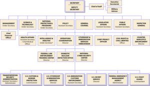 يرأس وزارة الأمن الداخلي الأمريكية وزير الأمن الداخلي بمساعدة نائب الوزير. يحتوي القسم على المكونات المدرجة أدناه.[11] لم تذكر كافة المكونات الفرعية ؛ راجع المقالات المرتبطة لمزيد من التفاصيل.