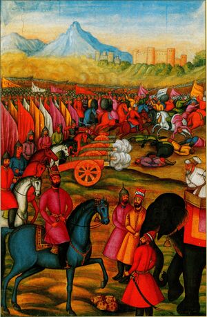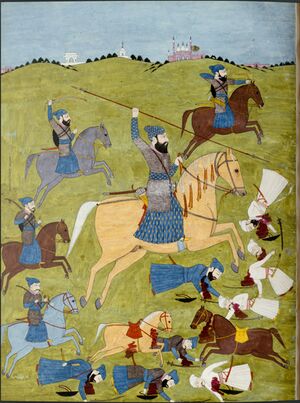 On 24 February 1739 Mughal and Afsharid forces fought the Battle of Karnal[87] Nader observed the massacre from behind the main line of jazāyers as they fired volley after volley into the reeling enemy before them. The cavalry of Khan Dowran, consisting of Indian Muslims,[88] looked down on fighting with muskets with contempt, which was a talent of the mostly Hindu infantrymen in India.[89][90] They prided themselves on sword-play and fancy-riding, while musketeers were not given importance in the Mughal military compared to Iran.[91][92] The heavy bullets of the jazāyer muskets, and the even more powerful cannonballs of the zamburaks, easily penetrated the armour of the war elephants. Many nobles were killed and captured amongst the Mughals; Khan Dowran himself was struck. Badly injured, he fell from his elephant as his own blood splattered over him, prompting his remaining retainers to scramble to his aid.[93]