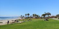 The Surf Line railroad tracks are adjacent to coastal bluffs some 40 أقدام (12 m) above the beach for 1.7 ميل (2.7 km).[13] Coastal erosion eats away at the bluffs each year.[14] The North County Transit District drove steel beams into the beach at the base of the bluffs in September 2020 to stabilize the face of the bluffs for 20 or 30 years.[15] The city wanted to require the transit agency to cover the shotcrete wall on the bluff with natural soil and native plantings. The city council, the California Coastal Commission, and residents have opposed the district's plans to install a chain-link fence that would stop pedestrians from crossing the tracks to get to the beach.[14] The district considered this to be a safety issue as trespassers along the right-of-way have been hit by trains.[16] This mile-and-a-half stretch (2.4 km) along the southern half of the city does not have legal access to the beach. Due to offshore reefs and wave patterns, this section has some of the best surfing in San Diego County.[17]