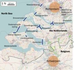 Unlike the Zuiderzee Works, the Delta Plan's purpose is largely defensive and not for land reclamation.[1] The Delta Plan is a national programme and demands collaboration between the national government, provincial authorities, municipal authorities and the water boards. The plan consisted of blocking the estuary mouths of the Oosterschelde, the Haringvliet and the Grevelingen. This reduced the length of the dikes exposed to the sea by 700 كيلومتر (430 mi). The mouths of the Nieuwe Waterweg and the Westerschelde were to remain open because of the important shipping routes to the ports of Rotterdam and Antwerp. The dikes along these waterways were to be heightened and strengthened. The works would be combined with road and waterway infrastructure to stimulate the economy of the province of Zeeland and improve the connection between the ports of Rotterdam and Antwerp.