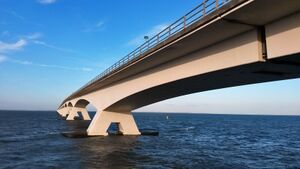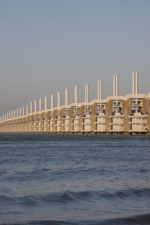 The Delta Plan originally intended to create a large freshwater lake, the Zeeuwse Meer (Zeeland Lake).[1] This would have caused major environmental destruction in Oosterschelde, with the total loss of the saltwater ecosystem and, consequently, the harvesting of oysters. Environmentalists and fishermen combined their efforts to prevent the closure; they persuaded parliament to amend the original plan. Instead of completely damming the estuary, the government agreed to build a storm surge barrier. This essentially is a long collection of very large valves that can be closed against storm surges.