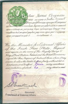 Request page of Irish Free State passport issued 1936. We, the Minister for External Affairs of the Irish Free State, Request and require, in the name of His Majesty George V. King of Great Britain, Ireland and the British Dominions beyond the Seas, Emperor of India, all those whom it may concern to allow the bearer to pass freely...etc.