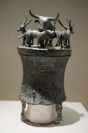 Iaroslav Lebedynsky and Victor H. Mair speculate that some Sakas may also have migrated to the area of Yunnan in southern China following their expulsion by the Yuezhi in the 2nd century BCE. Excavations of the prehistoric art of the Dian civilization of Yunnan have revealed hunting scenes similar to that of Indo-European artwork depicting horsemen in Central Asian clothing.[22] Horsemen practicing hunting are depicted in circular arrangement on top of drums, a design often encountered in Scythian art. Animal scenes of felines attacking oxen are also at times reminiscent of Scythian art both in theme and in composition.[23] These objects reflect the influence of steppe art.[24]