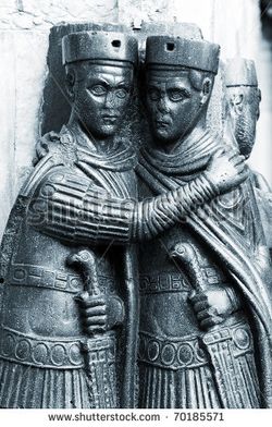 دقلديانوس مع ماكسيميان، اثنان من الحكم الرباعي، وهذا تمثال جرانيتي من نحت پورفيري، حوالي سنة 300م.