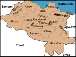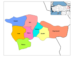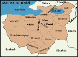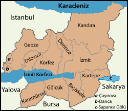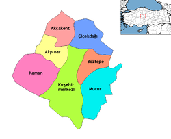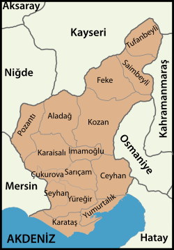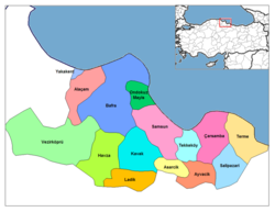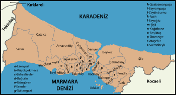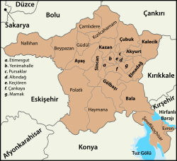 Most provinces bear the same name as their respective provincial capital districts. However, many urban provinces, designated as greater municipalities, have a center consisting of multiple districts, such as the provincial capital of Ankara province, The City of Ankara, comprising nine separate districts.[1] Additionally four provinces, Kocaeli, Sakarya, İçel and Hatay have their capital district named differently from their province, as İzmit, Adapazarı, Mersin and Antakya respectively.[2]