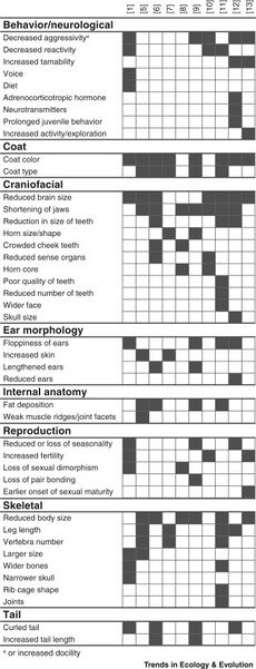 - ^ أ ب ت ث Wilkins, Adam S.; Wrangham, Richard W.; Fitch, W. Tecumseh (2014). "The "Domestication Syndrome" in Mammals: A Unified Explanation Based on Neural Crest Cell Behavior and Genetics". Genetics (in الإنجليزية). 197 (3): 795–808. doi:10.1534/genetics.114.165423. PMC 4096361. PMID 25024034.