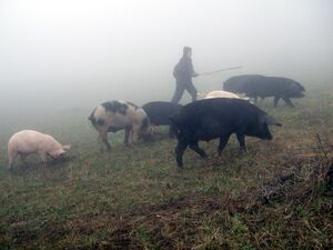 Geneticists have identified more than 300 genetic loci and 150 genes associated with coat color variability.[46][79] Knowing the mutations associated with different colors has allowed some correlation between the timing of the appearance of variable coat colors in horses with the timing of their domestication.[46][80] Other studies have shown how human-induced selection is responsible for the allelic variation in pigs.[46][81] Together, these insights suggest that, although natural selection has kept variation to a minimum before domestication, humans have actively selected for novel coat colors as soon as they appeared in managed populations.[46][52]