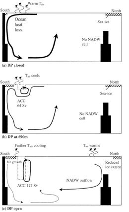 It has also been shown that present-day distribution of dissolved inorganic carbon can be obtained only with an open Drake Passage.[12]