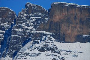 There are numerous caves in the easily eroded sandstone of Clarens Formation, the layer below the thick, hard basalt layer on the KwaZulu Natal-Lesotho border. Many of these caves have paintings by the San (Bushmen). This portion of the Drakensberg has between 35,000 and 40,000 works of San rock art,[9][17] and is the largest collection of such parietal work in the world.