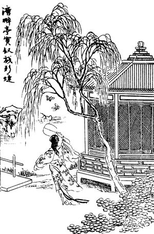 " كان حاجباها المقوسان القاتمان معقودين لكنهما غير مقطبين، عيناها الناطقتان قد جمعتا بين المرح والحزن، وفي ضعفها تكمن الفتنة. كانت عيناها تتألقان بالدمع، وكان تنفسها رقيقا ضعيفا. وفي هدوئها كانت كزهرة جميلة قد عكس خيالها في الماء. وفي حركتها بدت وكأنها غصن صفصاف رقيق يتمايل في الريح. لقد كانت أشد إرهافا في أحاسيسها من بى قان(1) وأكثر رقة من شى شى(2)."