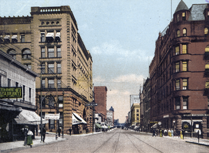 By 1857, copper resources were scarce and the area's economic focus shifted to timber harvesting. A nationwide financial crisis, the Panic of 1857, caused most of the city's early pioneers to leave. A history of Duluth written in 1910 says: "Of the handful remaining in 1859 four men were unemployed and one of those was a brewer. Capital idea; build a brewery. The absence of malt and hops and barley did not at all embarrass those stout-hearted settlers."[18] The water for brewing was obtained from a stream that emptied into Lake Superior that came to be called Brewery Creek. While the brewery "was not a pecuniary success", it became the Fitger Brewing Company a few decades later.[19]