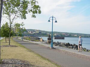 Duluth is a popular Midwest tourist destination. The city is home to the Great Lakes Aquarium, a freshwater aquarium. The Aerial Lift Bridge, next to Canal Park, crosses the Duluth Ship Canal into the Duluth–Superior harbor. Minnesota Point, known locally as Park Point, is the world's longest freshwater baymouth bar, stretching 6 ميل (10 km).[12] The city is also the starting point for road trips along the North Shore of Lake Superior to Thunder Bay, Ontario.