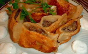 Chuchvara is a very small boiled dumpling typical of Uzbek and Tajik cuisine. Made of unleavened dough squares filled with meat, it is similar to the Russian pelmeni and the Chinese wonton, but in observance of the Islamic dietary rules, the meat filling is without pork. Chuchvara can be served in a clear soup or on their own, with vinegar or sauce based on finely chopped greens, tomatoes and hot peppers. Another popular way of serving chuchvara is topped with suzma (strained qatiq) or with smetana (sour cream), Russian-style.