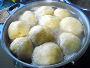 Banku and kenkey are West African preparations defined as dumplings in that they are steamed starchy balls of dough. Both are formed from fermented cornmeal. Banku is boiled and requires continuous kneading, while kenkey is partly boiled then finished by steaming in corn or banana leaves.[8]
