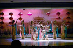 The Mogao grottoes in Dunhuang houses several form of fine arts such as dance and music.[1] It is filled with many dance images which inspired modern dance artists in China.[1] Images of flying apsaras (Feitian) from the grottoes are also a source of inspiration.[1]