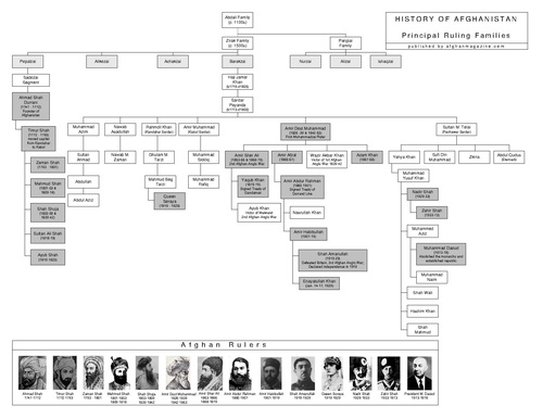 تاريخ العائلات الحاكمة الرئيسية في أفغانستان. الشجرة توضح انقسام خط زيرك إلى پوپل‌زاي، ألكوزاي، أتسك‌زاي (بارچ) (المنطقة التاريخية الشهيرة لقبائل بارچ هي Qilabes, LashgarGah و Showrawak) وفروع بارك‌زاي.