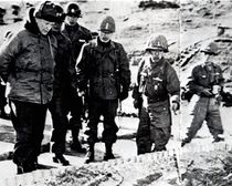 Eisenhower, as well as the officers and troops under him, had learned valuable lessons in their previous operations, and their skills had all strengthened in preparation for the next most difficult campaign against the Germans—a beach landing assault. His first struggles, however, were with Allied leaders and officers on matters vital to the success of the Normandy invasion; he argued with Roosevelt over an essential agreement with De Gaulle to use French resistance forces in covert and sabotage operations against the Germans in advance of Operation Overlord.[45] Admiral Ernest J. King fought with Eisenhower over King's refusal to provide additional landing craft from the Pacific.[46] Eisenhower also insisted that the British give him exclusive command over all strategic air forces to facilitate Overlord, to the point of threatening to resign unless Churchill relented, which he did.[47] Eisenhower then designed a bombing plan in France in advance of Overlord and argued with Churchill over the latter's concern with civilian casualties; de Gaulle interjected that the casualties were justified in shedding the yoke of the Germans, and Eisenhower prevailed.[48] He also had to skillfully manage to retain the services of the often unruly George S. Patton, by severely reprimanding him when Patton earlier had slapped a subordinate, and then when Patton gave a speech in which he made improper comments about postwar policy.[49]