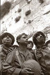 مظليون إسرائيليون بالقرب من حائط البراق بعد سقوط القدس الشرقية بيد إسرائيل في شهر يونيو سنة 1967.
