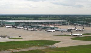 Communities known as New Towns, responses to urban congestion and World War II destruction, appeared in Basildon and Harlow (Essex), as well as in Stevenage and Hemel Hempstead (Hertfordshire), in the 1950s and 1960s.[9] In the late 1960s, the Roskill Commission considered Cublington in Buckinghamshire, Thurleigh in Bedfordshire, Nuthampstead in Hertfordshire and Foulness in Essex as locations for a possible third airport for London. A new airport was not built, but a former Royal Air Force base at Stansted, which had previously been converted to civilian use redeveloped and expanded in the following decades.[10]