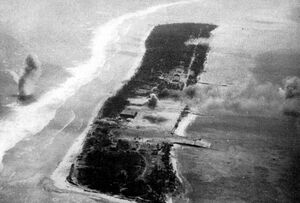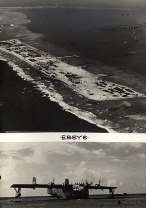 The Imperial Japanese Navy constructed a seaplane base on Ebeye in the early 1940s. Following the Battle of Kwajalein from 31 January to 3 February 1944, Ebeye was occupied by US forces. On 7 March the 107th Naval Construction Battalion was sent to Ebeye to redevelop the seaplane base. The Seabees repaired the existing 1،600-في-30-قدم (487.7 في 9.1 m) pier, adding a 50-في-240-قدم (15 في 73 m) ell extension, and also repaired a 250-قدم (76 m) Japanese H-shaped pier. The Seabees assembled a pontoon wharf and pontoon barges for transporting damaged carrier aircraft to repair units ashore. Further installations on Ebeye consisted of housing in floored tents and Quonset huts, a 150-bed dispensary, four magazines, 24،000 أقدام مربعة (2،200 m2) of covered storage, and a 4،000-US-barrel (480،000 L; 130،000 US gal; 100،000 imp gal) aviation-gasoline tank farm.[8]