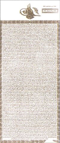 • In testimony of our promise we will, after having deposited these presents in the hall containing the glorious mantle of the Prophet, in the presence of all the ulama and the grandees of the Empire, make oath thereto in the name of God, and shall afterwards cause the oath to be taken by the ulama and grandees of the Empire.[9]