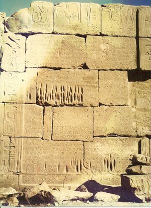 - ^ أ ب Breasted, Ancient Records of Egypt, volume III, §367, p.163: "There are two originals: (I) At Karnak on wall extending south of the great hypostyle, published by Champollion, Notices descriptives, 11, 195–204 (only 30 lines); Rosellini, Monumenti Storici, 116; Burton, Excerpta hieroglyphica, 17 (not used); Lepsius, Denkmdtler, 111, 146; Brugsch, Reczceil de monuments, I, 28 (11. 1–20); Bouriant,Recueil,XIII, 153-60;collationof thegeographicalnamesby Sayce, Proceedings of the Society of Biblical Archeology, XXI, 194 ff.; Miiller, 'Crw&ra- siatische Gesellschaft,VII, 5, Taf. I-XVI; I had also photographs by Borchardt. (2) At the Ramesseum; only fragments of the last 10 lines; Champollion, Notices descriptives, I, 585, 586; Sharpe, Egyptian Inscriptions, 11,50; Bouriant, Recueil, XIV, 67–70. In spite of the mutilated condition of the two monuments, the fre- quent repetitions make restoration certain in almost all cases. Miiller's edition is the only one which is done with care and accuracy; a number of readings may be added to Muller's text from Sharpe's copy, which seems to have escaped him. The following translation was already in my manuscript when Miiller's publication appeared. His text added a few new readings, but otherwise the translation remains unchanged."