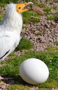 The nominate population, especially in Africa, is known for its use of stones as tools. When a large egg, such as that of an ostrich or bustard, is located, the bird walks up to it with a large pebble held in its bill and tosses the pebble by swinging the neck down over the egg. The operation is repeated until the egg cracks from the blows.[67] They prefer using rounded pebbles to jagged rocks. This behaviour, although believed to have been first reported by Jane Goodall in 1966, was actually already known to Africans and was first reported by J. G. Wood in 1877.[68][69] However, this has only been reported in Africa and has not been recorded in N. p. ginginianus.[13] Tests with both hand-reared and wild birds suggest that the behaviour is innate, not learnt by observing other birds, and elicited once they associate eggs with food and have access to pebbles.[70] Their ability to deal with ostrich eggs is utilized by brown-necked ravens which form groups that wait for the eggs to be broken before collectively mobbing the vultures and engaging in kleptoparasitism.[71] Another case of tool-use described from Bulgaria involves the use of a twig as a tool to roll up and gather strands of wool to use for lining the nest.[72]